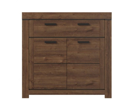 - Nowoczesny deseń brązowego dębu został podkreślony dekoracyjnymi, czarnymi frezami.