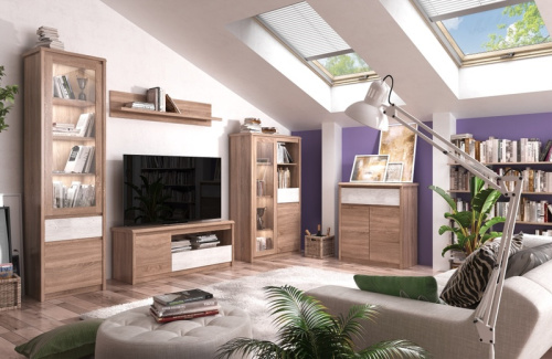- Kolekcja jest w naturalnym odcieniu dąb sonoma, który został rozświetlony dodatkami w kolorze sosna canion.