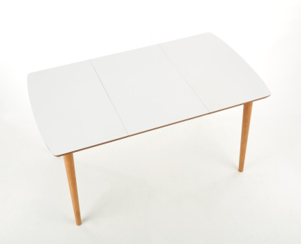 rozkładany, materiał‚: MDF okleinowany / drewno lite - bukowe, kolor: blat - biały mat, nogi - dąb lefkas