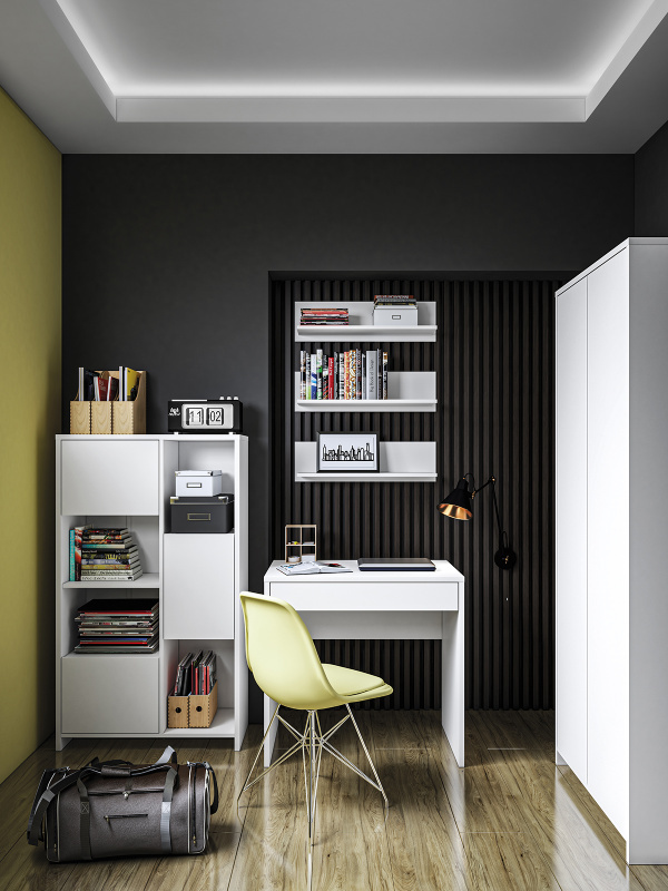 Dwa optymalne biurka, gwarantujące komfort pracy i nauki, dwie nowoczesne i pojemne komody, dwie szafy – duża z przesuwnymi drzwiami oraz mniejsza z systemem otwierania drzwi push to open – oraz praktyczna półka wisząca to elementy uniwersalnej i minimalistycznej kolekcji białych mebli pasujących do każdego współczesnego wnętrza. Białe meble rozjaśnią i powiększają optycznie przestrzeń, a geometria i bezuchwytowość brył podkreśli nowoczesny charakter pomieszczenia.
